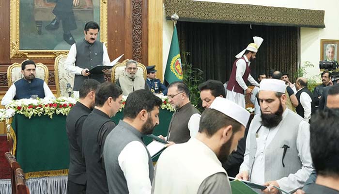 گورنر ہاؤس پشاور میں منعقدہ تقریب میں صوبائی کابینہ کے 10 ارکان نے بحیثیت وزراء اپنے عہدوں کا حلف اٹھایا۔
